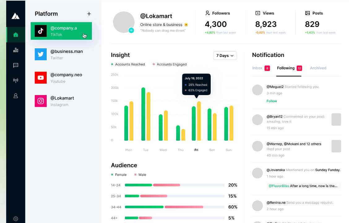 Manage all your social media platforms from one powerful dashboard. Schedule posts, monitor engagement, respond to messages, and track performance, all in one place.